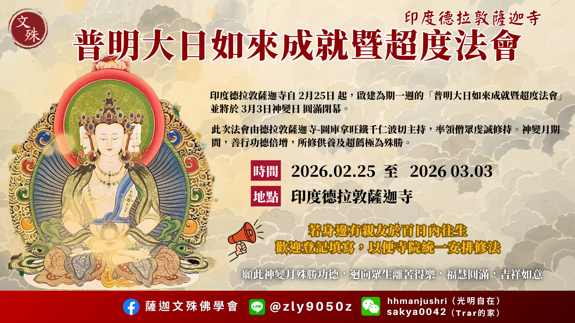 今天是 2026 年神变月的最后一天,也是藏历的正月三十日。在这个功德增长万倍的吉祥日子里,印度德尔敦的萨迦寺正进行着一场极为殊胜的法事——「普明大日如来超度法会」。