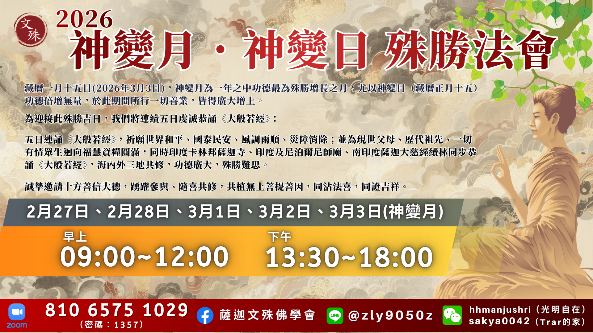 三月三日,适逢藏历神变月的「神变日」,此日为一年之中极为殊胜的吉祥日之一。神变月被视为功德增长百万倍的殊胜时刻,行一切善法,其功德皆远胜平日。值此难得因缘,文殊佛学会特别恭请各地寺院共同修持殊胜法会,广为众生累积福慧资粮。