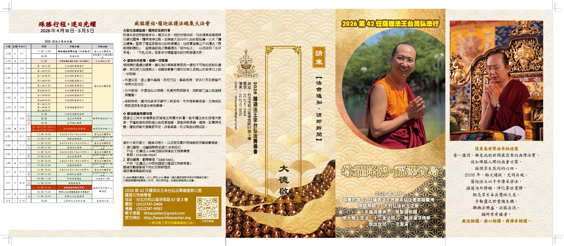 諸位法友 扎西德勒:讓大家久等了!經過長期的籌備,我們滿懷喜悅地誠摯宣布:尊貴的 第42任薩迦法王 2026年來台弘法行程已正式確認! 這是一場極為難得且殊勝的法筵。法王將親傳包括喜金剛、十尊隨許及金剛瑜珈母等深奧教法,並於台北、新竹等地與具緣法友們共結甚深法緣,令法雨普潤。